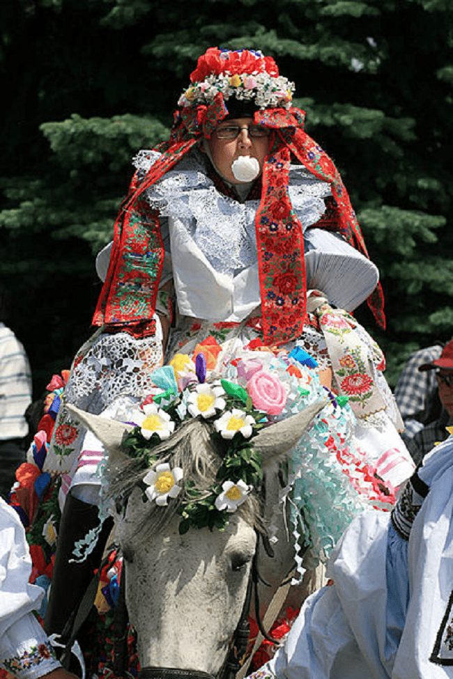 V čele průvodu jedou na koních praporečník a vyvolávači, za nimi král s pobočníky se šavlemi a průvod uzavírají výběrčí. Král i pobočníci jsou v dívčích krojích. Král je chlapec ve věku 10 až 12 let, má zahalenou tvář pentlemi a v ústech bílou růži jako symbol nevinnosti, vznešenosti a mlčenlivosti. Družina vtipnými vyvolávkami poukazují na dobu, vlastnosti obyvatel a žádají o dary pro krále.